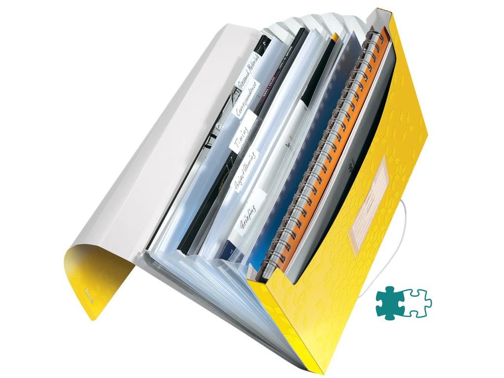 Aktovka z polypropylénu na ukladanie a prenos dokumentov do formátu A4. V dizajne WOW v žiarivých farbách. Atraktívne uzatváranie na gumičku, šesť roztiahnuteľných priehradok s indexami na popis obsahu, jedna priehradka na voľne vložené listy do formátu A4, vrecko na vizitky. Kapacita 250 listov. Väčšie balenie 5 ks. Farba žltá.Dodatočné parametre