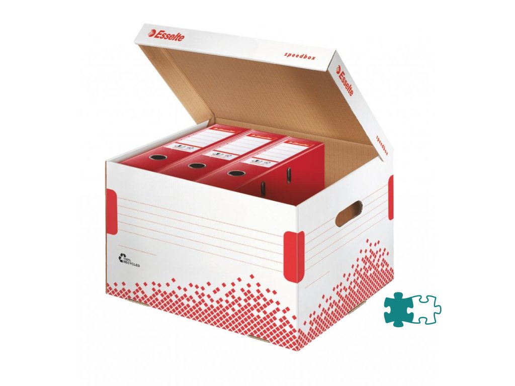 Archívne krabice so sklápacím vekom z archivačného systému Speedbox. Spevnené steny aj dno pre maximálnu pevnosť a odolnosť pri stohovaní. Ideálne na prenos dokumentov alebo rôznych predmetov. Vyrobené zo 100% recyklovanej vlnitej lepenky. Farba biela/ červená. Rozmery 392 × 301 × 334 mm. Kapacita 5 zakladačov šírky chrbta 75 mm. Väčšie balenie 15 kusov.Dodatočné parametre