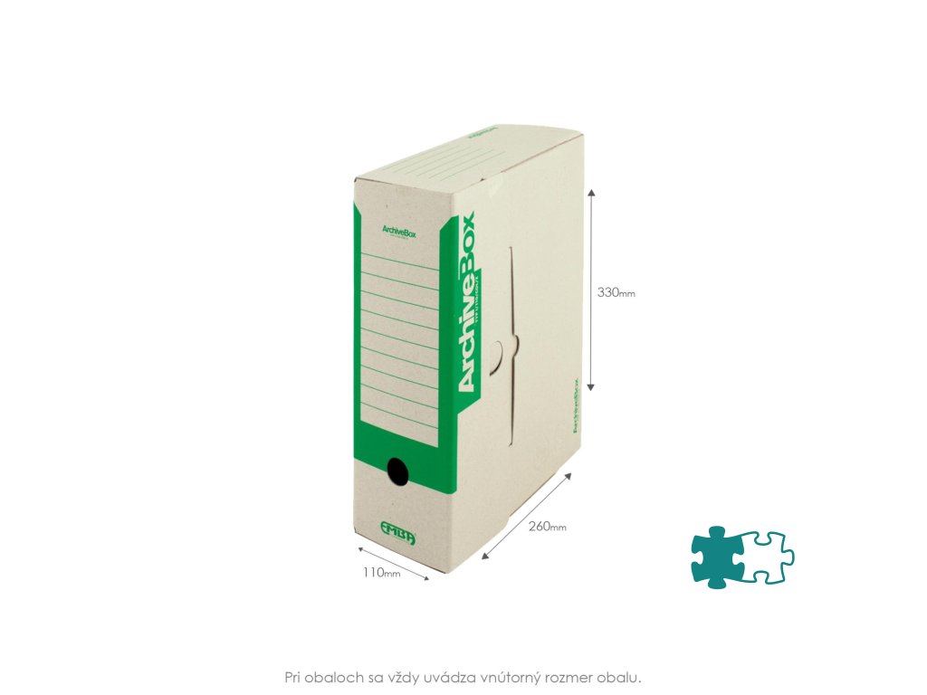 Archívny box z hladkej lepenky na uloženie záznamov do 25 rokov. Používa sa pri rozdelení agendy, účtovných rokov alebo ako firemná farba. Možnosť prehľadného popisu, uloženie v troch polohách. Vhodný v kombinácii so skupinovým boxom - možnosť vložiť 5 boxov I/ 75 alebo kombináciu boxov I/ 50, I/ 75 a I/ 110. Rozmery 110 × 330 × 260 mm. Dodávaný v rozloženom stave. Väčšie balenie 25 ks.Dodatočné parametre