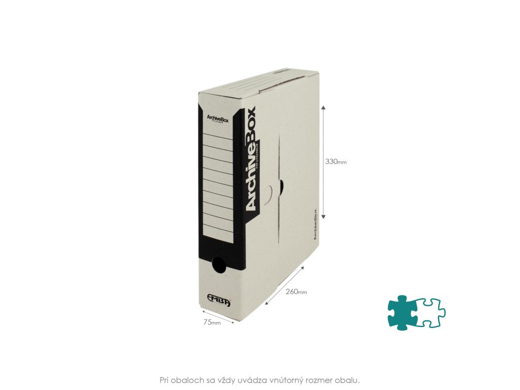 Systém archívnych boxov a škatúľ z vlnitej lepenky. Dodávané v rozloženom stave. Farba prírodná hnedá. Archívny box z hladkej ručnej lepenky, 1 000 g/ m². Konštrukčné riešenie boxu umožňuje rýchly prístup k vloženým dokumentom. Rozmery75 × 330 × 260 mm. Väčšie balenie 25 ks. Farba čierna.