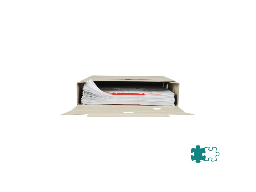 Systém archívnych boxov a škatúľ z vlnitej lepenky. Dodávané v rozloženom stave. Farba prírodná hnedá. Archívny box z hladkej ručnej lepenky, 1 000 g/ m². Konštrukčné riešenie boxu umožňuje rýchly prístup k vloženým dokumentom. Rozmery75 × 330 × 260 mm. Väčšie balenie 25 ks. Farba modrá.