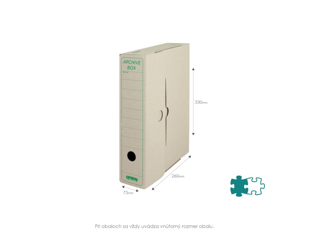 Ekologický výrobok. Box z recyklovateľnej špeciálne impregnovanej lepenky odolnej voči atmosferickej vlhkosti na dlhodobé uloženie záznamov. Tri varianty postavenia, kvalitná sieťotlač. Vhodný v kombinácii so skupinovým boxom. Väčšie balenie 25 ks. Rozmery (š x v x d) 75 x 330 x 260 mm.Dodatočné parametre