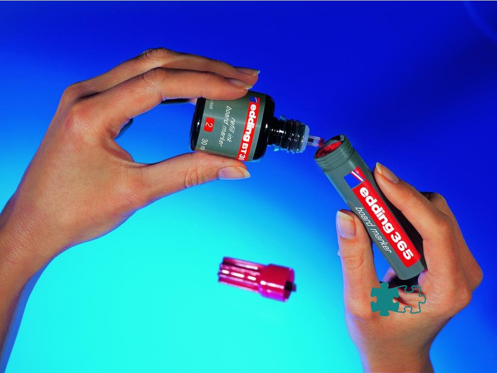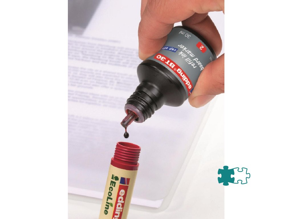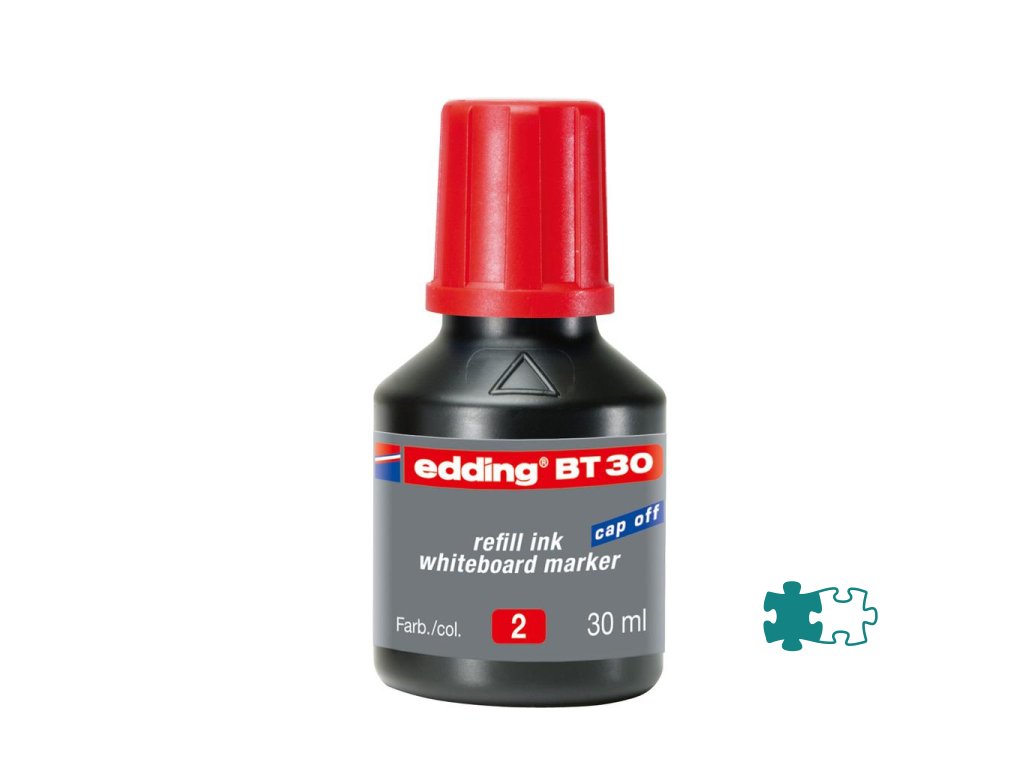 Atrament slabého zápachu vo fľaštičke s kvapkovým dávkovačom na dopĺňanie popisovačov edding 250, 361 a 365, určených na biele tabule. Tento chemický prípravok je nebezpečný. Obsah fľaštičky 30 ml.Farba: červená