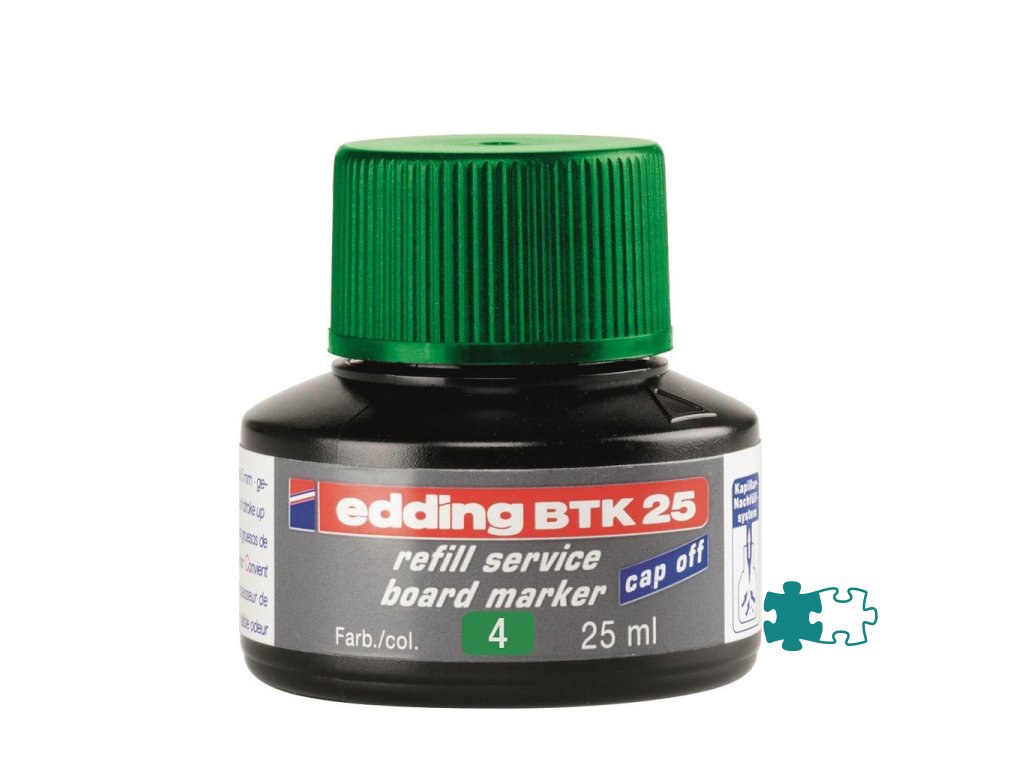 Atrament slabého zápachu s kapilárnym systémom na dopĺňanie popisovačov edding 250, 360, 361 a 363, určených na biele tabule. Tento chemický prípravok je nebezpečný. Obsah fľaštičky 25 ml.Pri doĺňaní vložte prednú časť popisovača špičkou do fľaštičky a po niekoľkých minútach bude popisovač pripravený k opätovnému použitiu.Farba: zelená