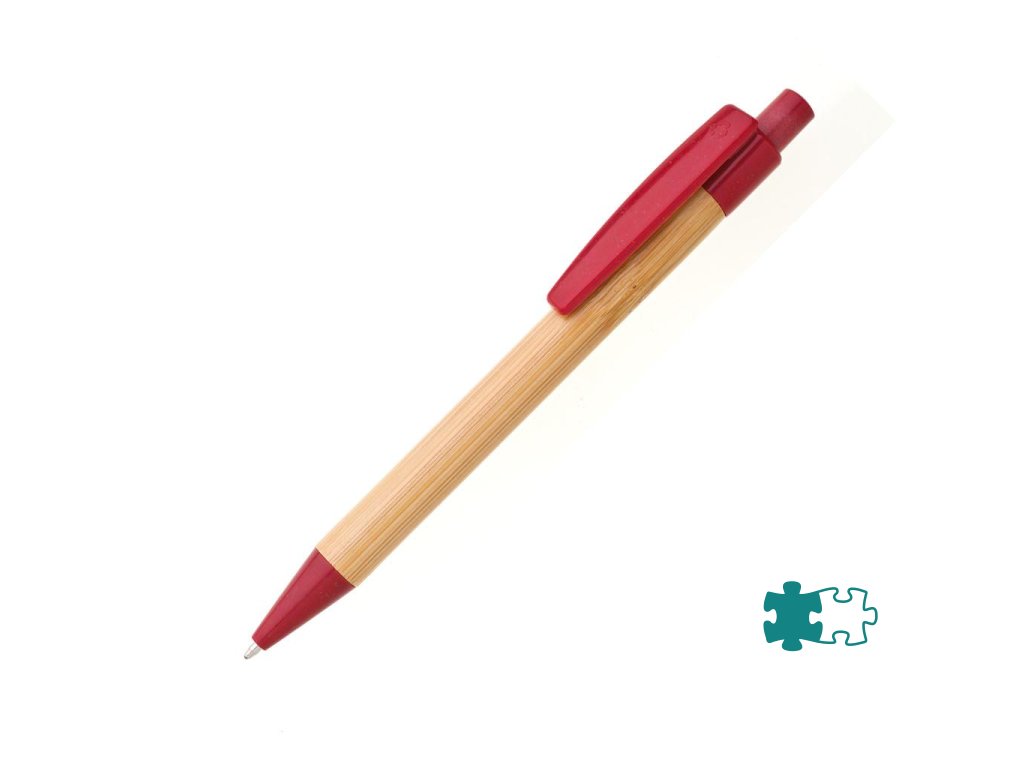 Bambusové telo pera s doplnkami z plastu s podielom slamy. Náplň modro píšuca veľkoobsahová. Farba červená.Dodatočné parametre