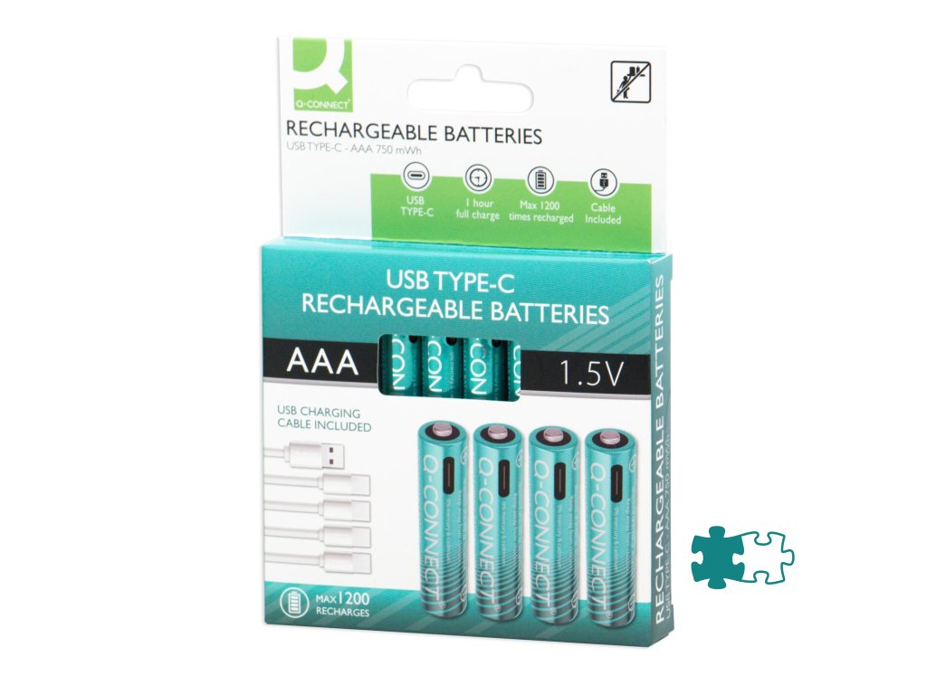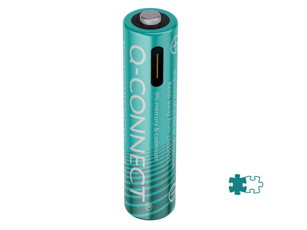 Nabíjteľné AAA batérie Q-Connect, ktoré je možné jednoducho nabiť pomocou pripojenia USB-C, rovnako ako napríklad telefón. Doba doba nabíjania je 2h. Súčasťou balenia sú 4 ks nabíjateľných batérií a 1 ks kábla.Dodatočné parametre