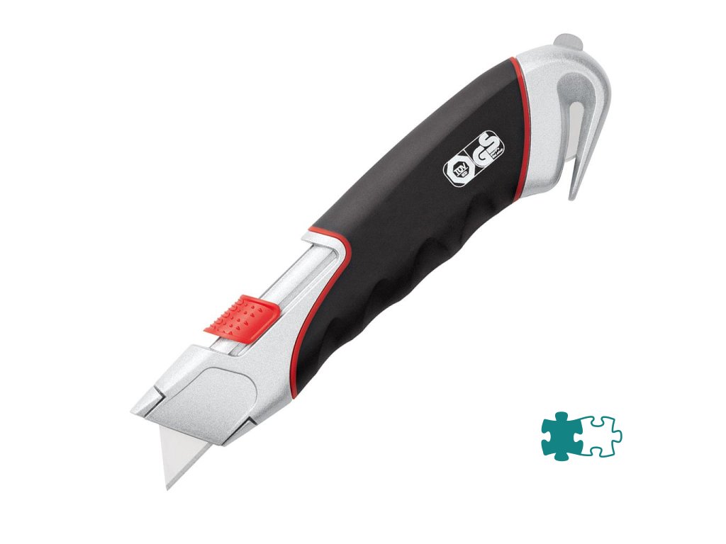 Rezač s funkciou plne automatického návratu čepele, t. j. čepeľ sa rýchlo po rezaní zasunie späť. Ergonomický kovový úchyt s gumenou zónou, trapézová pružinová čepeľ, integrovaná krytá okrúhla čepeľ na konci rezača umožňuje bezpečné rezanie zmršťovacej fólie, káblov, pásikov a pod. Vhodný pre pravákov i ľavákov. Dodávaný vrátane trapézového a okrúhleho noža 25 mm z karbónovej ocele. Schválené inštitútom TÜV. Farba čierna/ červená.Dodatočné parametre