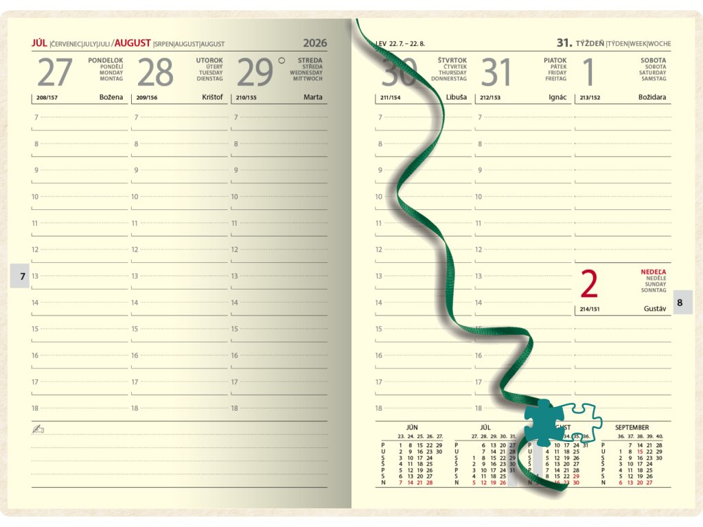Certifikovaný týždenný diár s prehľadným slovenským kalendáriom na každý týždeň. Na obal je použitý vysokokvalitný papier NAPURA s prírodným dizajnom, 100 % recyklovateľný, s lacetkou. Vďaka vysokej kvalite vlákien je možná: termorazba, razba fóliou alebo ÚV tlač.Formát: 142 x 204