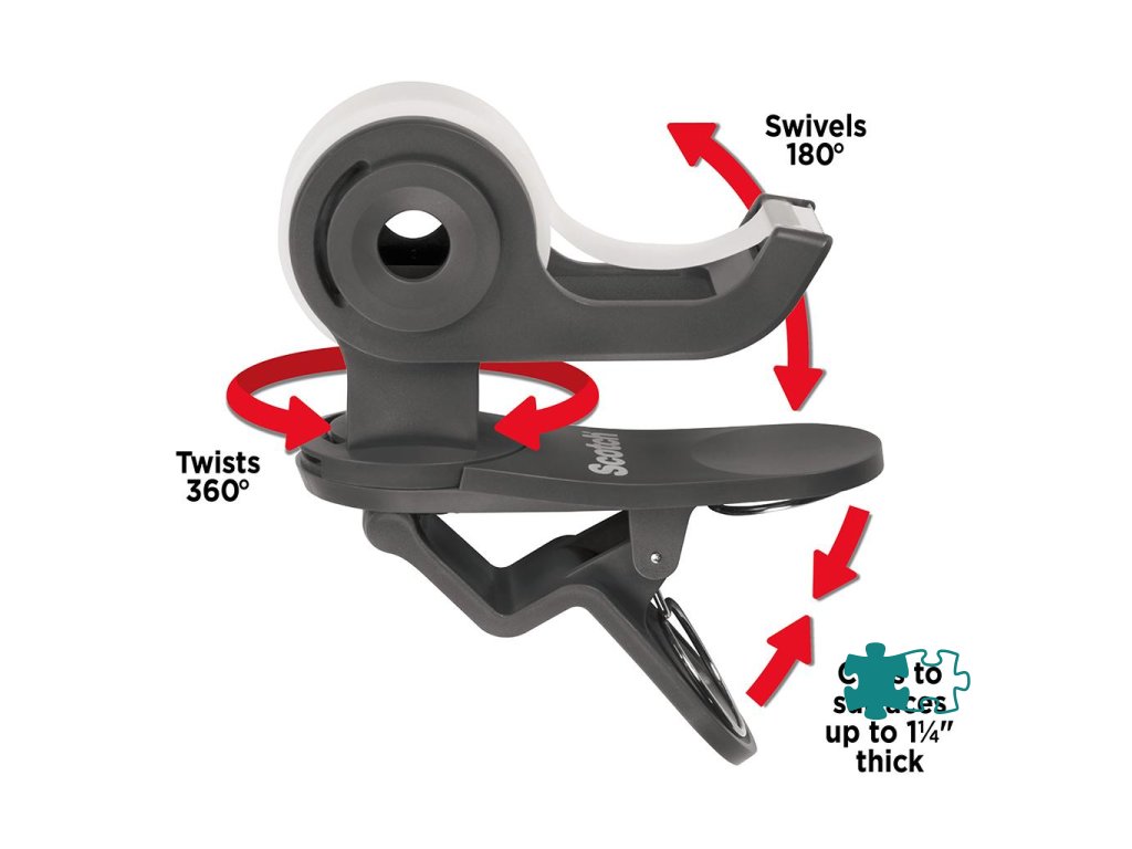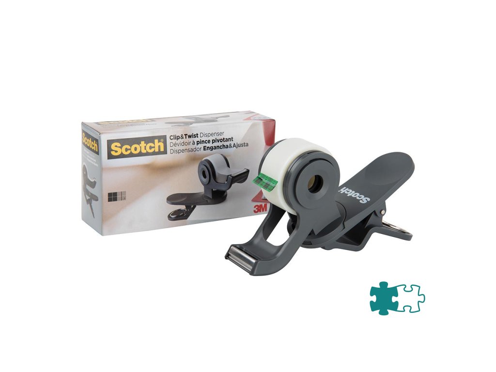 3M™ Scotch® Otočný zásobník C19 s páskou Scotch® Magic™ rozmerov 19 mm × 8,89 m. Horizontálna rotácia 360°, vertikálna rotácia 180°. Praktické využitie v kancelárii alebo doma, ľahké odtrhnutie pásky jednou rukou. Farba čierna.360° - horizontálna rotácia