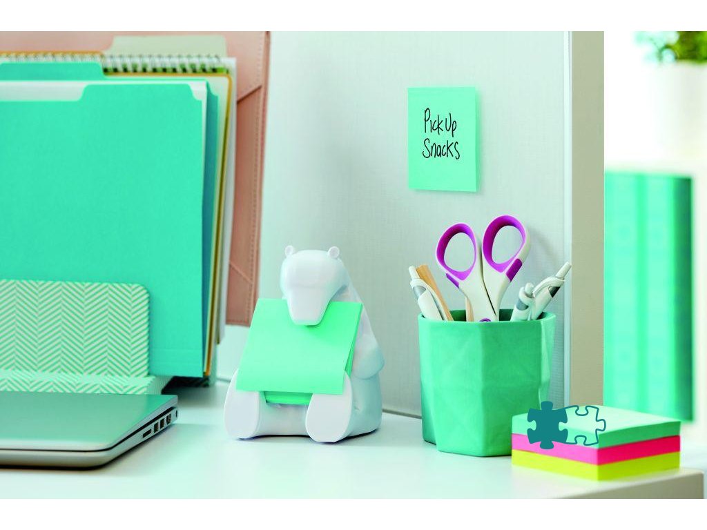 Stolový dispenzor v tvare medveďa dodávaný s balením silne lepiaceho modrého Z-bločku rozmerov 76 × 76 mm, 90 listkov. Zaťažený dispenzor umožní jednoduché vytiahnutie lístka jednou rukou. Farba dispenzora biela.- Rýchle a ľahké riešenie.