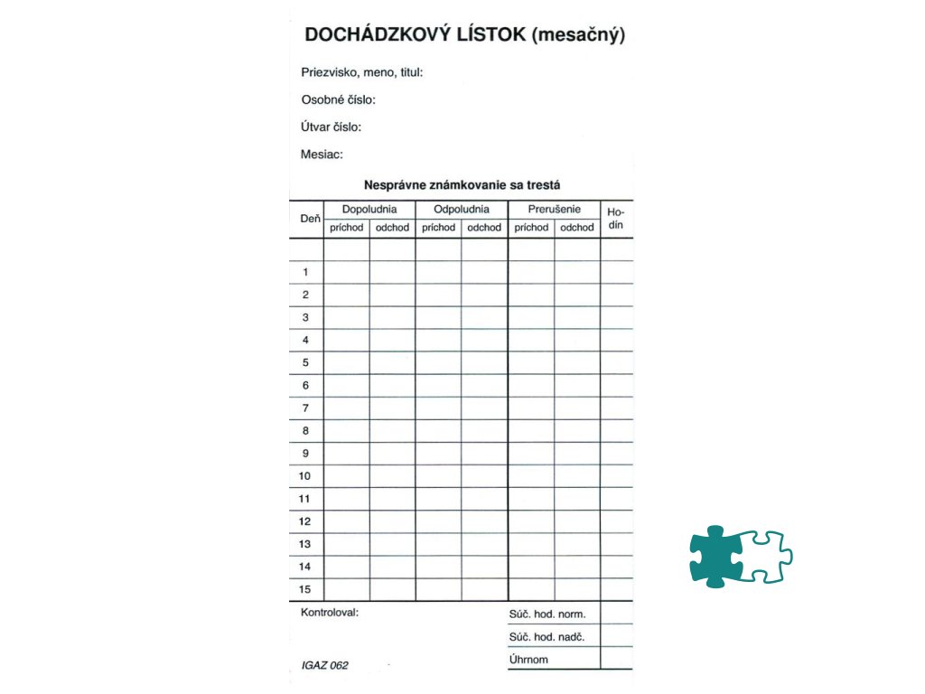Tlačivo : Dochádzkový lístok mesačný (kartón).Dodatočné parametre