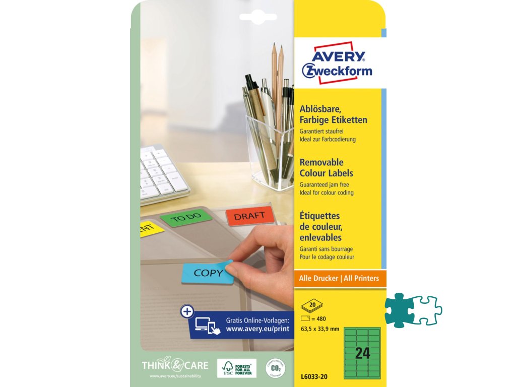 Etikety Avery odnímateľné 63,5x33,9 mm, zelené