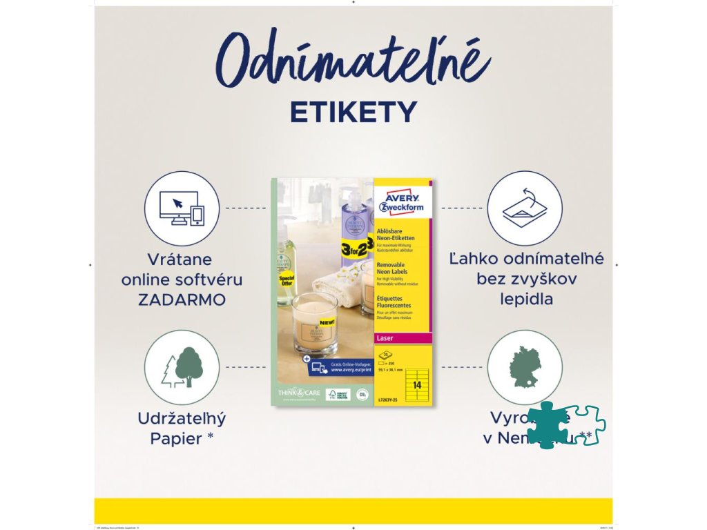 Odnímateľné samolepiace etikety STICK & LIFT odlepiteľné a znovu prelepiteľné (na bežnom povrchu až 5×) bez toho, aby zanechali stopy lepidla. Sú vhodné pre laserové tlačiarne. Využiteľné najmä na každodenné pracovné činnosti, ako napr. vytváranie popisov, cenoviek, označovanie výrobkov, majetku a pod. Farba neónovo žltá. Etikety na hárku 14 ks. Balenie 25 hárkov.Dodatočné parametre
