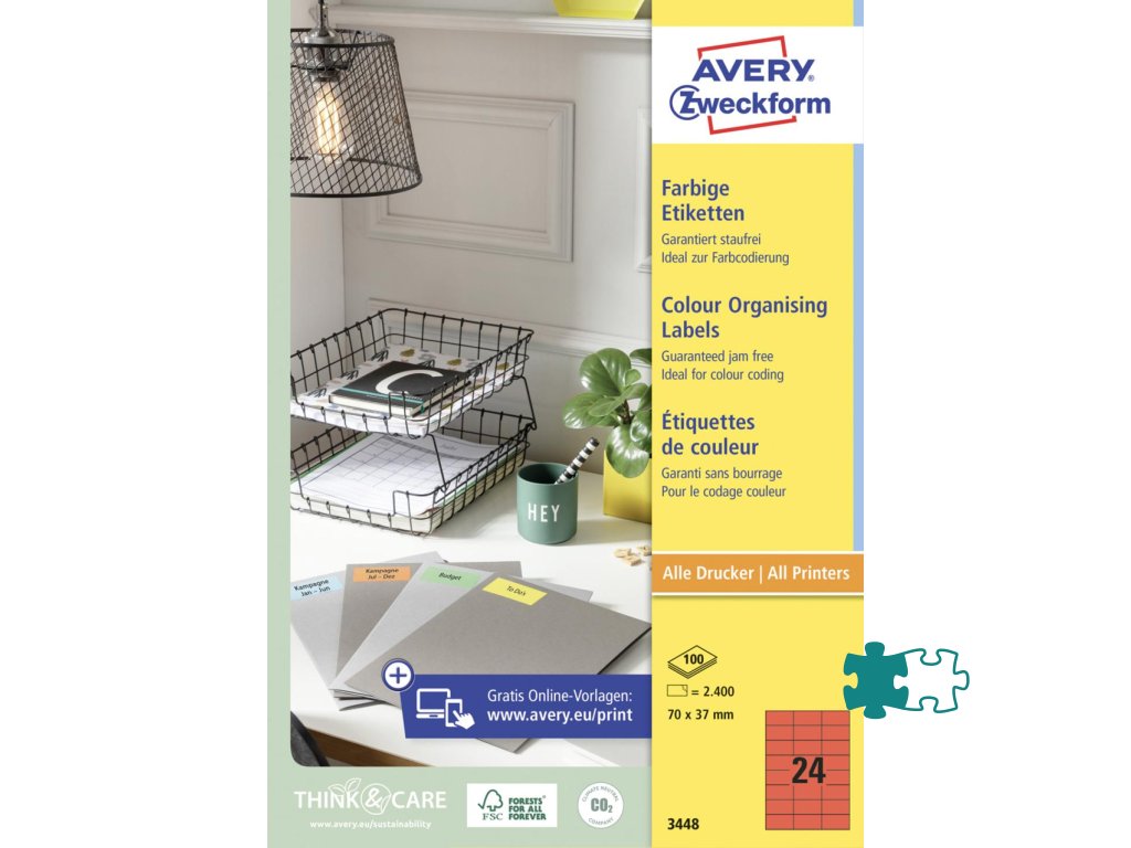 Farebné univerzálne etikety určené na každodenné použitie v atramentových a laserových tlačiarňach a kopírovacích strojoch. Perfektná tlač, špeciálne lemovanie etikiet zabraňuje zanášaniu tlačiarne lepidlom, vďaka vynikajúcej priľnavosti a vysokej kvalite papiera sa etikety v tlačiarni nezasekávajú. Formát A4. Balenie 100 hárkov.Dodatočné parametre