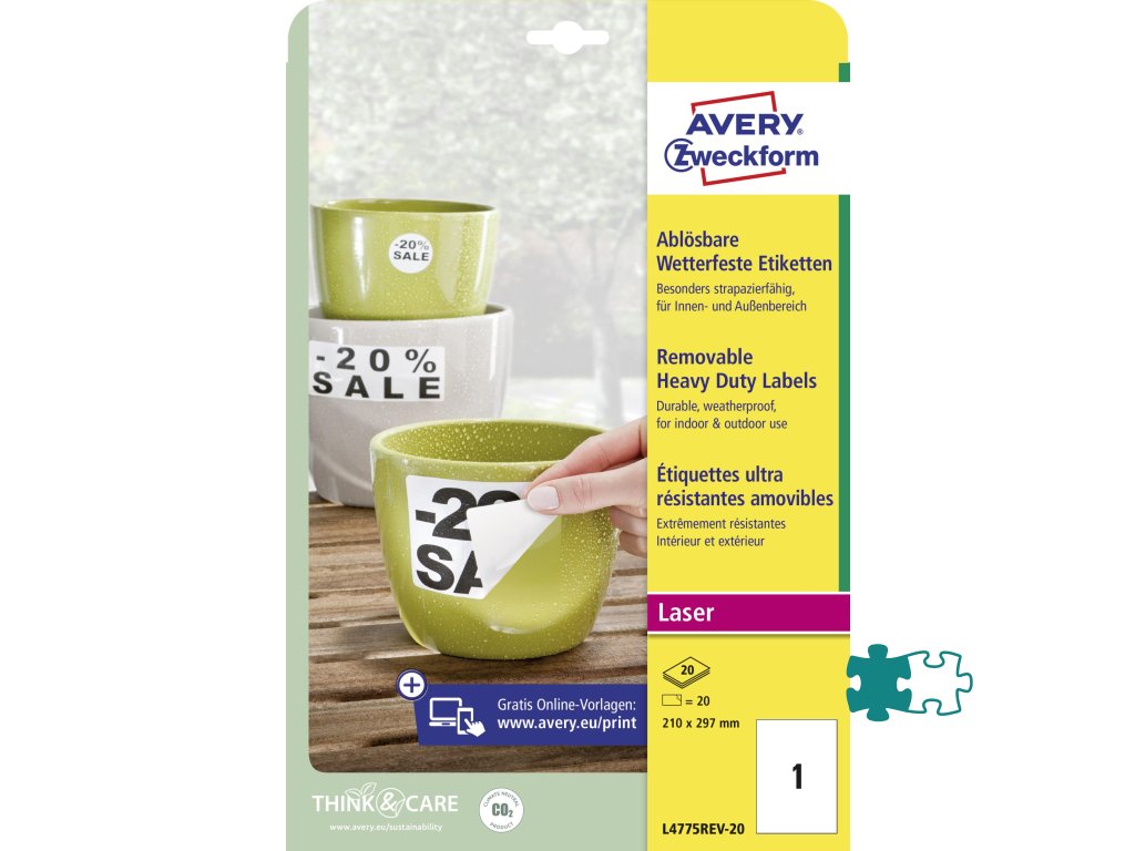Etikety polyesterové veľmi odolné 210x297mm Avery A4 biele odnímateľné 20 hárkov