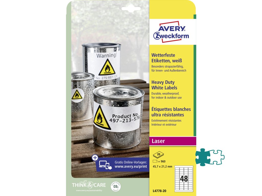Veľmi odolné polyesterové etikety odolné voči oleju, prachu, špine, natrhnutiu, vode. Odolné voči teplotám od -20° do +80°C. Sú určené pre tlač v laserových, farebných laserových tlačiarňach a kopírkach a sú vhodné aj pre vonkajšie použitie.Rozmery v mm : 45,7 × 21,2. Farba biela. Etikety na hárku 48 kusov. Balenie 20 hárkov.