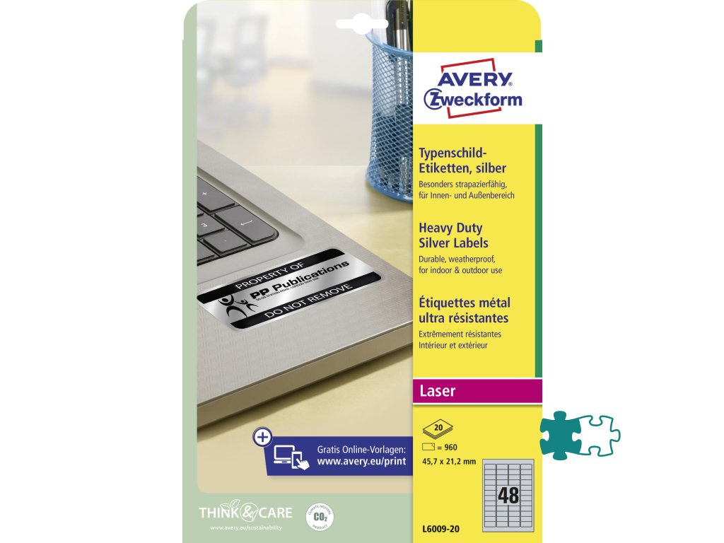 Veľmi odolné polyesterové etikety odolné voči oleju, prachu, špine, natrhnutiu, vode. Odolávajú teplotám od −40 ° do + 150 °C. Určené pre tlač v laserových tlačiarňach. Vhodné aj pre vonkajšie použitie. Rozmery v mm : 45,7 × 21,2. Farba strieborná. Etikety na hárku 48 kusov. Balenie 20 hárkov.Dodatočné parametre