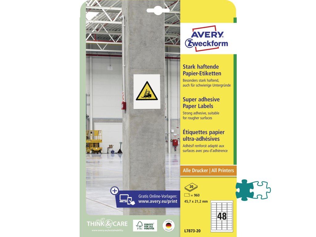 Biele, extrémne priľnavé papierové štítky sú dvakrát pevnejšie ako bežné papierové štítky. Vďaka tomu sú štítky vo formáte 45,7 x 21,2 mm obzvlášť vhodné na identifikáciu a označovanie produktov a inventára a na vytváranie varovných a bezpečnostných upozornení v interiéri. Papierové štítky sa lepia aj na ťažké povrchy, ako sú nerovné, drsné, vlhké alebo zaprášené povrchy pri rôznych teplotách. Môžete sa spoľahnúť na zaručený chod tlačiarne bez zaseknutia bez akýchkoľvek usadenín lepidla v tlačiarni. Etikety je možné tlačiť na všetkých bežných laserových a atramentových tlačiarňach.Dodatočné parametre