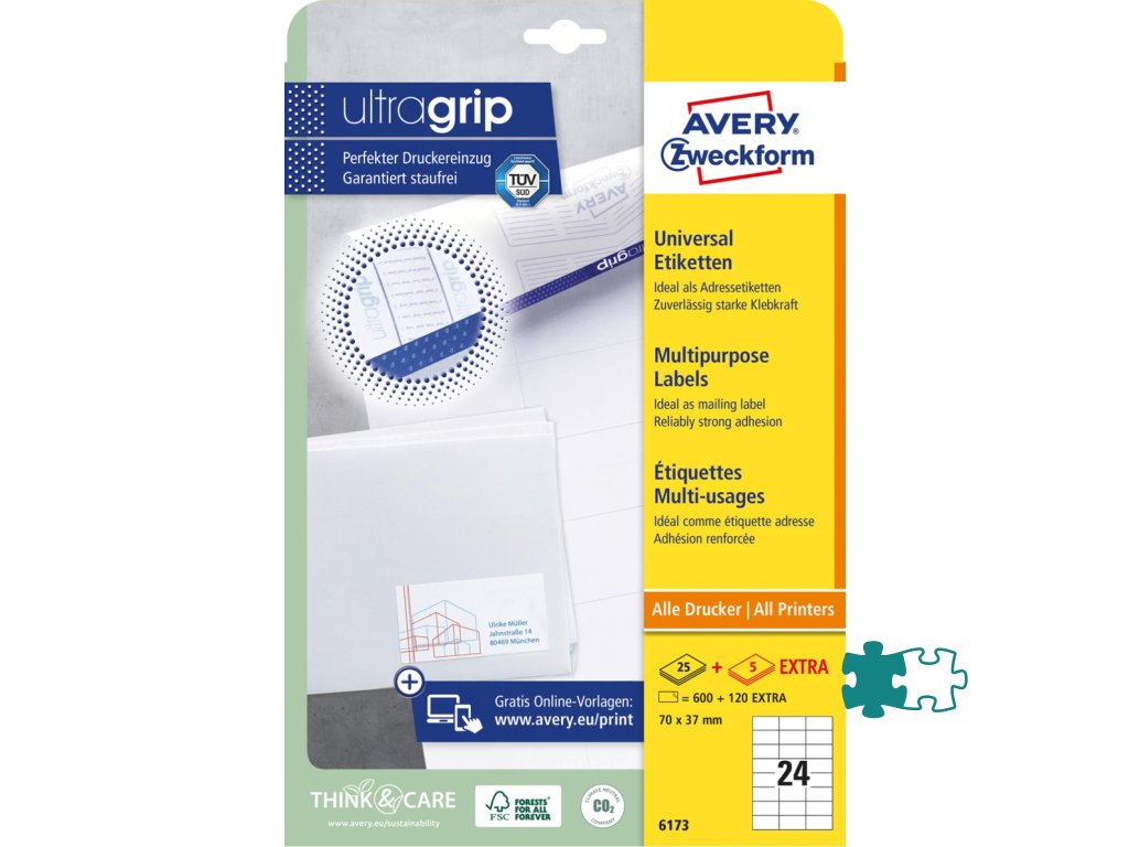 Biele univerzálne etikety vhodné na každodenné použitie v atramentových a laserových tlačiarňach a kopírovacích strojoch. Vďaka inovatívnej technológie ultragrip sa môžete spoľahnúť na bezchybné natiahnutie archu a tlač bez zasekávania. Bezpečnostný okraj QCT zabraňuje zanášaniu tlačiarne lepidlom. Pre laserové tlačiarne testovanéa certifi kované TÜV SÜD. Vysoká lepivosť na rôznych povrchoch. Ostrá tlač bez bez rozmazávania. Etikety sú vyrobené spôsobom šetrným k životnému prostrediu, majú certifi káciu FSC®, sú bielené bez použitia chlóru. Šablóny a softvér pre jednoduchú a rýchlu tlač etikiet k dispozícii zdarma. Formát A4. Balenie 25 + 5 hárkov.