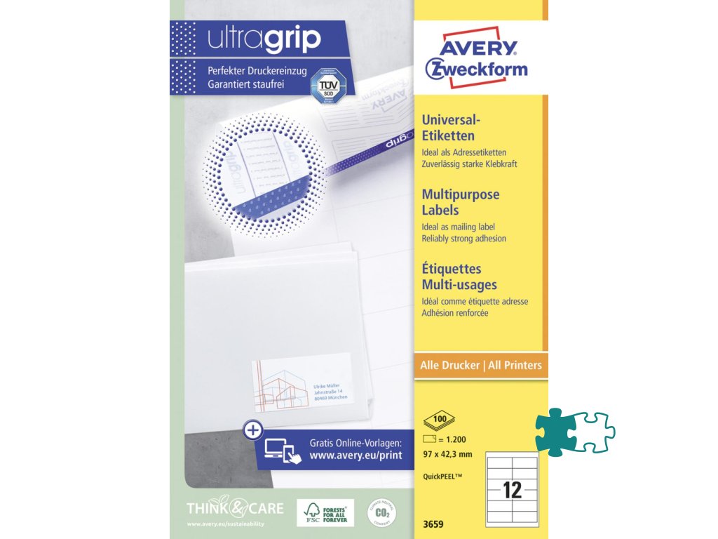 Etikety univerzálne 97x42,3mm Avery A4 100 hárkov