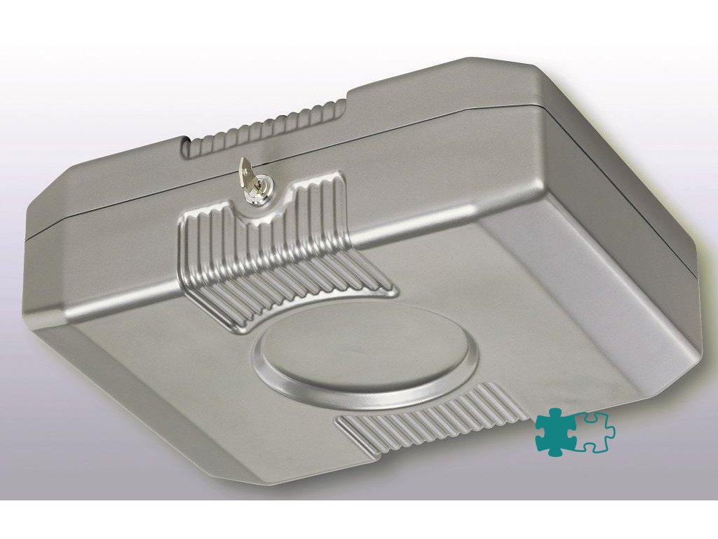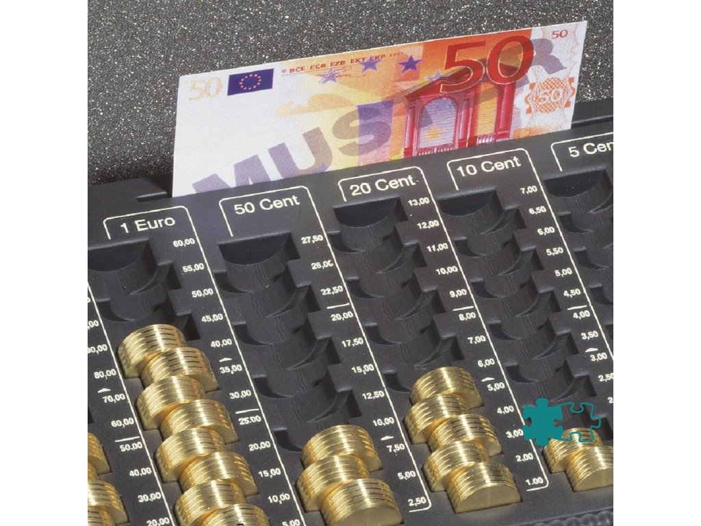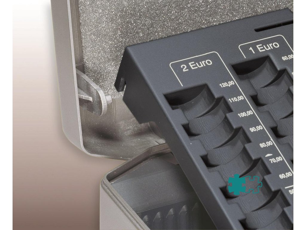 Pokladnička z povrchovo upravenej ocele vybavená mincovou priehradkou s ôsmimi oddielmi na eurá a centy v maximálnej hodnote 233,90 Euro. Štyri prístupné priehradky na bankovky, priestor na poukážky a stravné lístky v spodnej časti. Vnútorné časti vyrobené z nárazu vzdorného materiálu.Sklápateľné ergonomicky tvarované madlo prispieva k dobrému držaniu, pena na vnútornej strane veka zabraňuje premiešaniu mincí pri prenose, dvojzápadkový zámok zvyšuje bezpečnosť. Pokladničky sú vzájomne stohovateľné.Rozmery: 352×120×276 mm