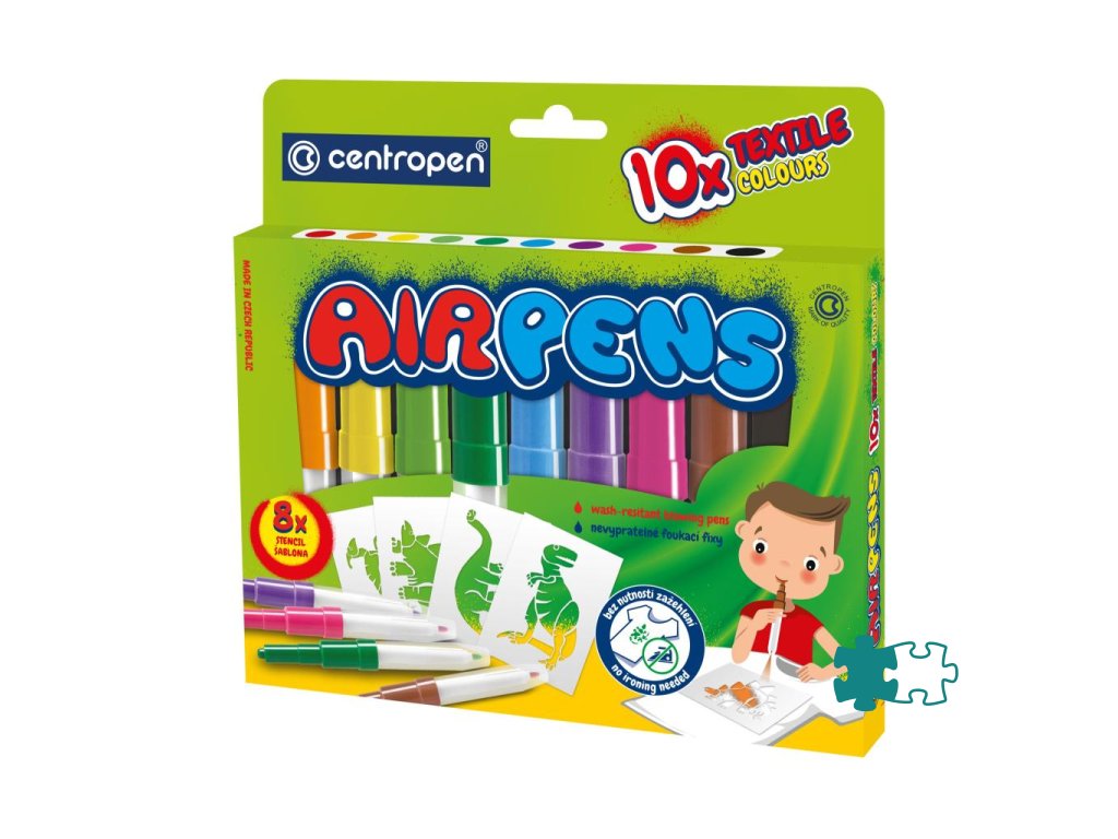 Fúkacie fixy na textil v sade 10 ks s 8 šablónami. Zdraviu neškodlivý atrament. Kresby odolajú praniu do 60 °C bez nutnosti zažehlenia.Dodatočné parametre
