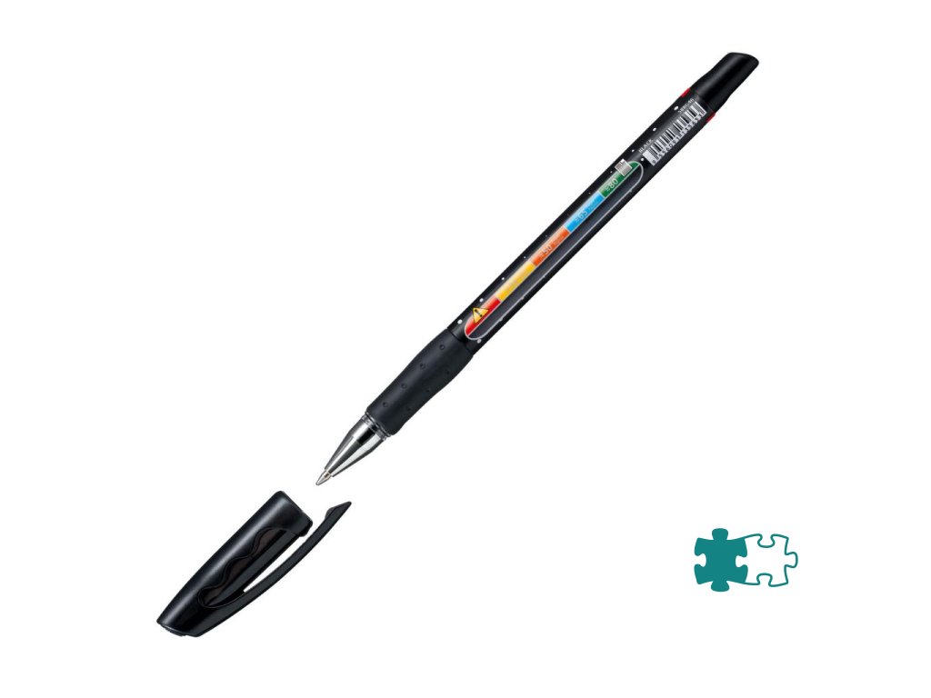 Plastové guľôčkové pero s priehľadom s ukazovateľom hladiny zostávajúceho atramentu, resp. počtu strán, ktoré je možné ešte napísať. Vhodné najmä pre školákov a študentov pri skúškach a testoch. Elastická úchytová zóna pre uvoľnené držanie, ľahko tečúci atrament pre rýchle a čisté písmo. Šírka stopy 0,45 mm. Väčšie balenie 10 ks.Dodatočné parametre