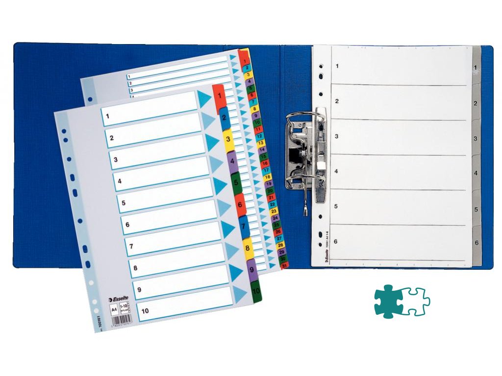 Rozraďovač vyrobený z kvalitného silného kartónu. Formát A4, vystužené eurodierovanie, farebné plastové rozlišovacie okraje, popisovateľný titulný list s farebnou potlačou na jasnú identifikáciu obsahu. Balenie jedna sada v polyesterovom sáčku. Väčšie balenie 10 sád.Formát: A4
