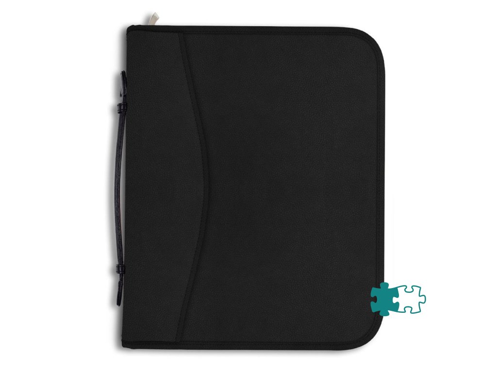Konferenčná mapa so zipsom a rukoväťou na prenášanie, vybavená 4-krúžkovou mechanikou, vreckami niekoľkých veľkostí. V prevedení imitácie kože, úprava matná. Šírka chrbta 47 mm.Farba: čierna