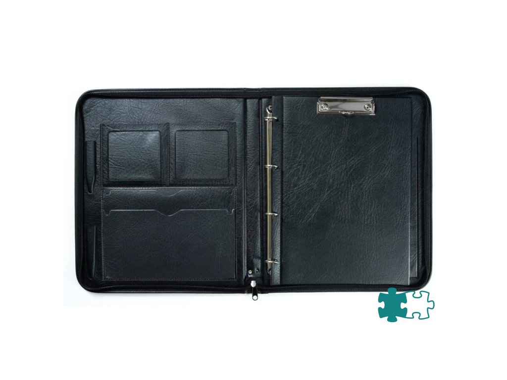 Konferenčná mapa so zipsom, vybavená 4-krúžkovou mechanikou, vreckami niekoľkých veľkostí, vložkami na vizitky a CD, úchytmi na písacie potreby a vyberateľnou písacou podložkou s klipom. Prevedenie imitácia kože Hanibal. Šírka chrbta 35 mm.Farba: čierna