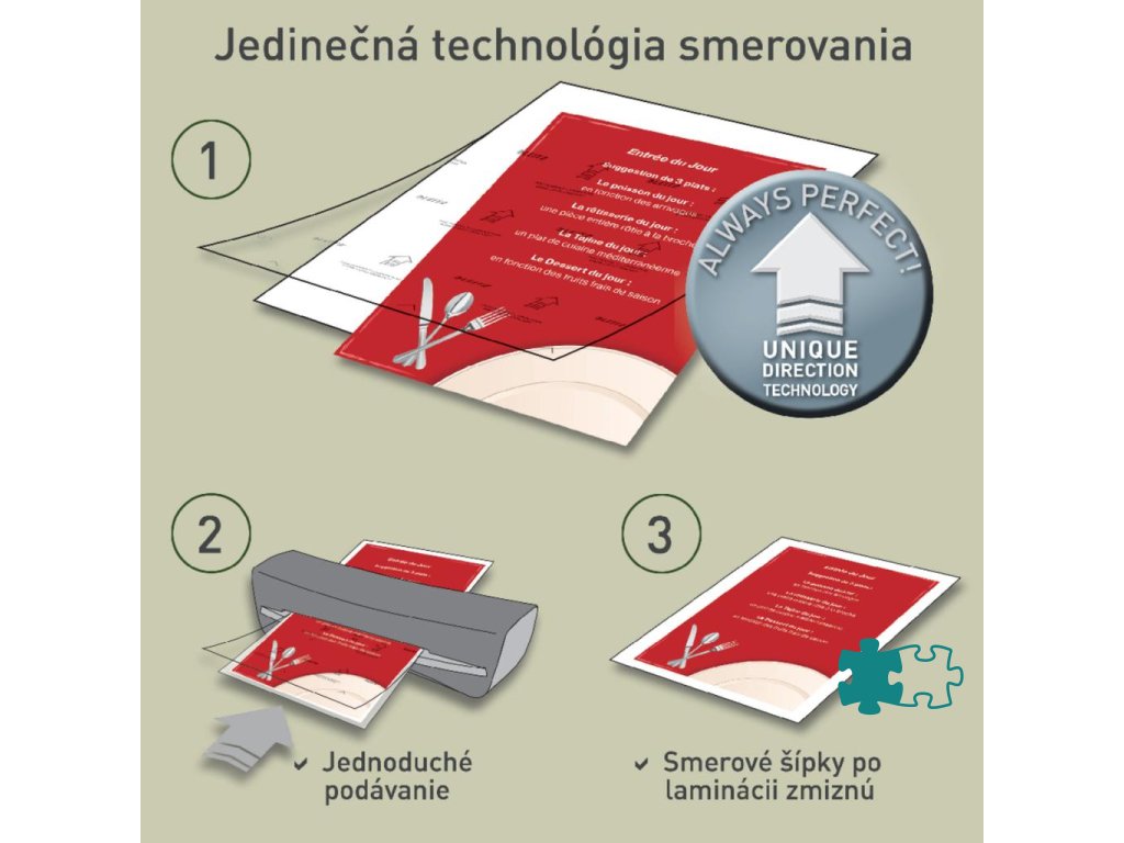 Už žiadne obavy, že vložíte obal do laminátora nesprávnym smerom. Jedinečná smerovacia technológia (UDT) prináša dokonalé výsledky. Obaly najvyššej kvality chránia zalaminovaný dokument.- Unikátna smerovacia technológia navádza k správnemu vloženiu obalu v smere šípok, ktoré sú umiestnené na obale a ktoré po laminácii zmiznú