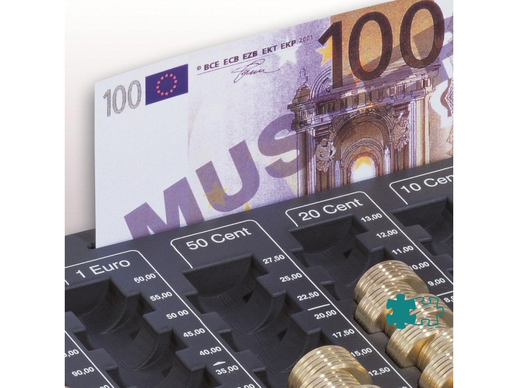Samostatná mincová priehradka z tvrdého plastu, rozmerovo vhodná do bežnej stolovej zásuvky. Osem oddielov na eurá a centy v maximálnej hodnote 233,90 Euro, priehradka na bankovky, poukážky alebo stravné lístky vo vrchnej časti.Rozmery: 324 x 34 x 190 mm