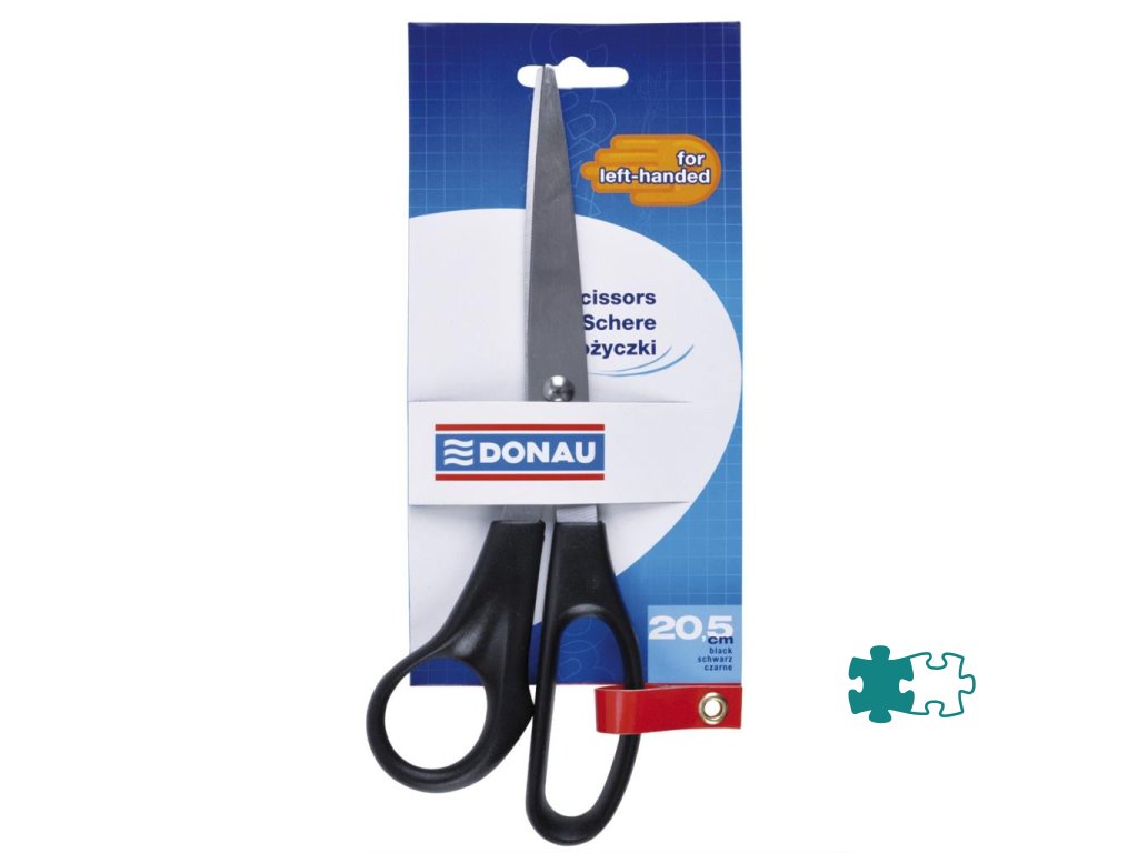 Kancelárske nožnice pre ľavákov na strihanie papiera, kartónu, lepenky, samolepiacej pásky a pod. s pogumovaným úchytom a strihacou časťou z nehrdzavejúcej ocele. Farba čierna.Veľkosť: 20,5 cm