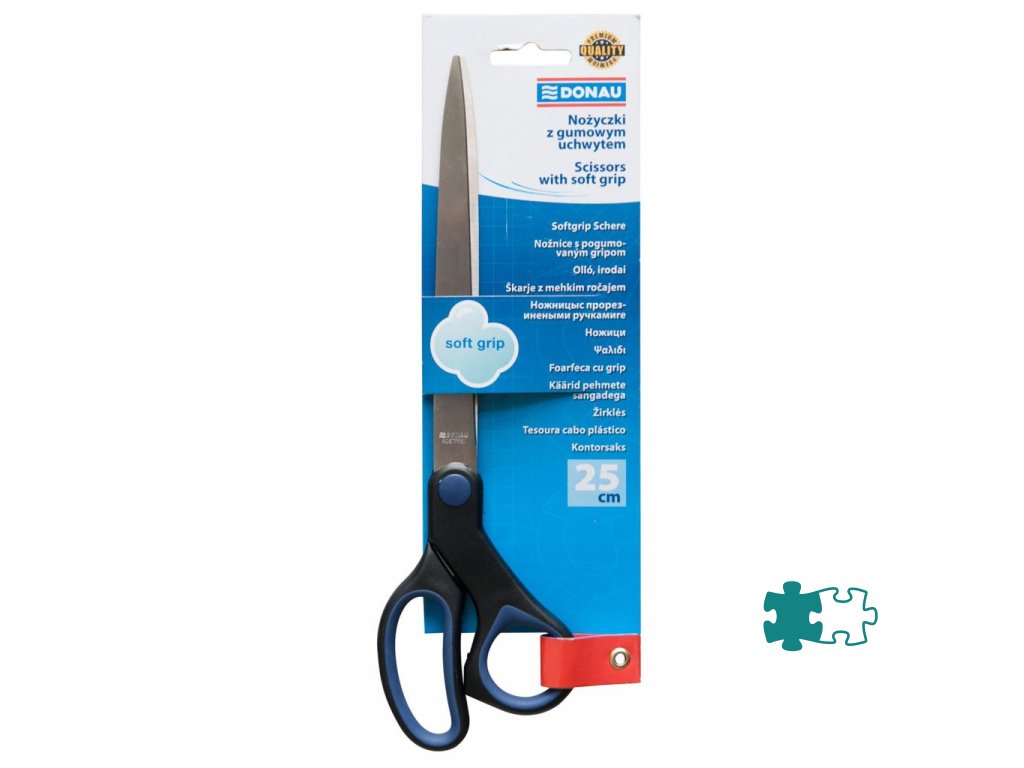 Kancelárske nožnice na strihanie papiera, kartónu, lepenky, samolepiacej pásky a pod. s pogumovaným úchytom a strihacou časťou z nehrdzavejúcej ocele. Farba čierna/-modrá.Veľkosť: 25 cm