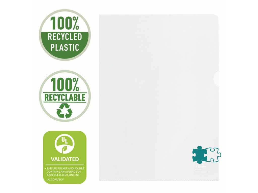 Ekologicky šetrný a opakovateľne recyklovateľný obal „L“ vyrobený v Európe zo 100% recyklovaného PP. Formát A4 s horným a pravým otváraním, ideálny na použitie v kancelárii, domácej kancelárii a v škole. Prvotriedny reliéfny povrch. Vnútorný mikrofi lm proti kopírovaniu bráni odtlačeniu textu z papiera na plast. Materiál bez obsahu kyselín chráni pred žltnutím papiera, preto je ideálny na dlhodobú archiváciu dôležitých dokumentov. Balený v 100% recyklovateľnej krabici z recyklovaného papiera.Dodatočné parametre