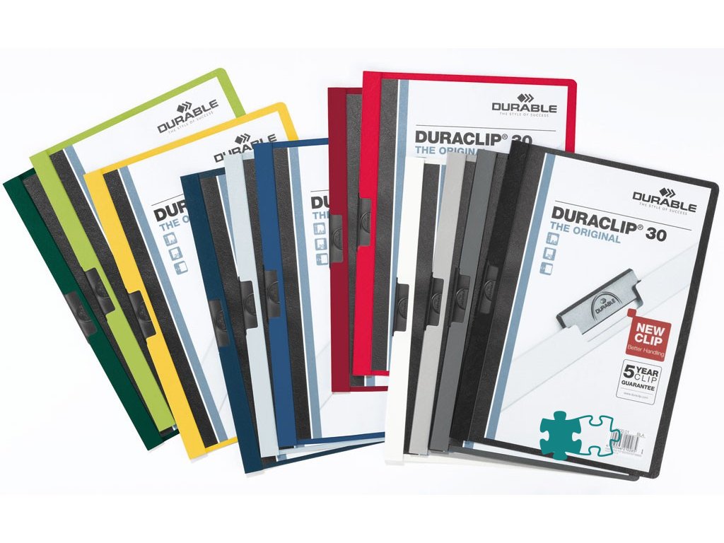 Obal vyvinutý spoločnosťou DURABLE pre viazanie nedierovaných listov. Materiál z PVC s unikátnym kovovým klipom, ktorý sa prispôsobí vloženému počtu listov a priehľadnou prednou stranou. Ideálny na prezentácie, ponuky, správy, poznámky na konferencie, semináre a pod. Formát A4. Kapacita 1-30 listov. Väčšie balenie 25 ks.Kapacita: 1-30 listov