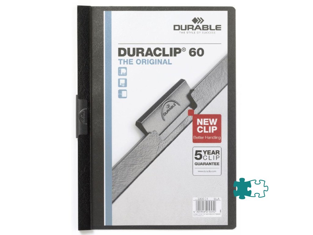 Obal vyvinutý spoločnosťou DURABLE pre viazanie nedierovaných listov. Materiál z PVC s unikátnym kovovým klipom, ktorý sa prispôsobí vloženému počtu listov a priehľadnou prednou stranou. Ideálny na prezentácie, ponuky, správy, poznámky na konferencie, semináre a pod. Formát A4. Kapacita 1-60 listov. Väčšie balenie 25 ks.Kapacita: 1-60 listov