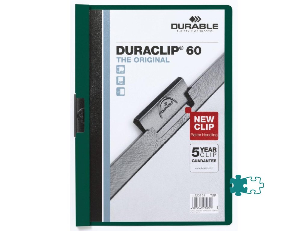 Obal vyvinutý spoločnosťou DURABLE pre viazanie nedierovaných listov. Materiál z PVC s unikátnym kovovým klipom, ktorý sa prispôsobí vloženému počtu listov a priehľadnou prednou stranou. Ideálny na prezentácie, ponuky, správy, poznámky na konferencie, semináre a pod. Formát A4. Kapacita 1-60 listov. Väčšie balenie 25 ks.Kapacita: 1-60 listov