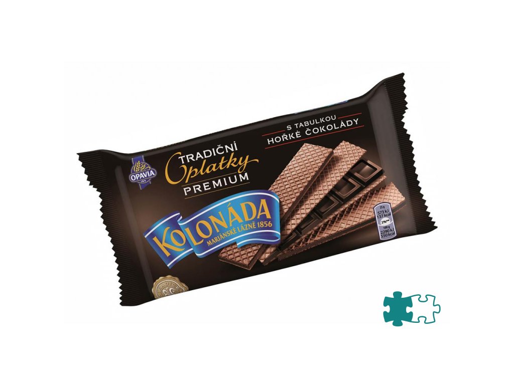Trandičné krehké oblátky Kolonáda plnené tabuľkou horkej čokolády. Hmotnosť 92 g.