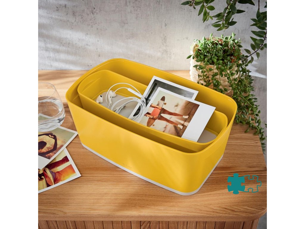 Značková kolekcia Leitz Cosy vám umožní cítiť sa ako doma, nech už vás pracovný deň zavedie kamkoľvek. Vďaka minimalistickému dizajnu a lákavej matnej povrchovej úprave pridáte svojmu pracovnému priestoru štýl a farbu. Organizér je ideálny na uloženie všetkých malých predmetov, ako sú písacie potreby, drobné domáce náradie alebo napríklad make up. MyBox má certifikáciu Food safe, je vhodný na prenos teplých aj studených jedál, na uloženie potravín ako čaju, kávy, mlieka a cukru vo firemnej kuchynke či na recepcii, doma na ovocie a pod. Organizér je súčasťou modulárneho úložného systému Leitz MyBox, je kompatibilný s malým organizačným boxom, ale môže byť používaný aj samostatne. Rozmery: š 307 × v 55 × h 105 mm. Štýlový organizér na malé predmety alebo organizačná priehradka do boxu veľkosti S Leitz MyBox. Zaujme lákavými matnými farbami a minimalistickým dizajnom. Farba žltá.Dodatočné parametre