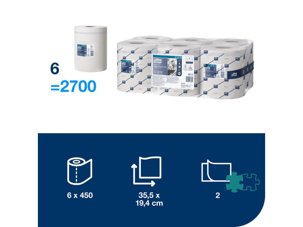 Viacúčelové papierové utierky 2 vrstvové sú ideálne na stieranie a ručné utieranie. Vhodné do zásobníka so stredovým odvíjaním na dávkovanie po jednom útržku TORK Refl ex™, ktorý znižuje spotrebu a minimalizuje riziko krížovej kontaminácie. Vydávanie po jednom útržku znižuje spotrebu až o 37 %. V predaji po balení (6 roliek).Farba: biela