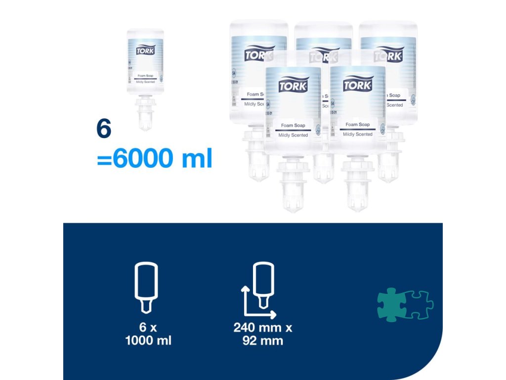 Jednorazová náplň jemného penového mydla prémiovej kvality do dávkovačov TORK, ktoré sú overené ako ľahko používateľné a všetkým používateľom zabezpečujú správnu hygienu rúk. Vysokokvalitné krémové penové mydlo je jemne parfumované, vrátane vyživujúcich a obnovujúcich prísad, na šetrné umytie rúk. Jednoduchá výmena v priebehu niekoľkých sekúnd. Poskytuje starostlivosť pre normálnu a suchú pokožku. Obsahuje 2 500 dávok. Objem 1 liter. Svieža vôňa. (kartón obsahuje 6 ks)