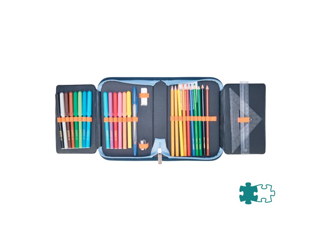 Peračník 2-klopý s výbavou, vnútorná podšívka: farebná. Výbava: 14 fixiek, 8 šesťhranných pasteliek, 2 ceruzky šesťhranné, 1 plastové strúhadlo, 1 guma, 1 plastové pravítko 16 cm, 1 trojuholníkové pravítko, 1 guľôčkové pero, 1 rozvrh hodín, 1 vizitka. Dizajn: TechMech.Dodatočné parametre