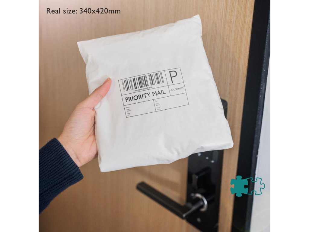 Biele nepriehľadné plastové obálky Q-Connect s čiernym vnútrom, vyrobené zo 100 % recyklovaného materiálu. Trojvrstvová odolná PE fólia 50 mic. Kuriérske tašky sú odolné, vodeodolné, odolné voči roztrhnutiu a prepichnutiu. Majú pevný jednopáskový samotesný uzáver. 100 kusov v krabici.Rozmery: 340 x 420 mm
