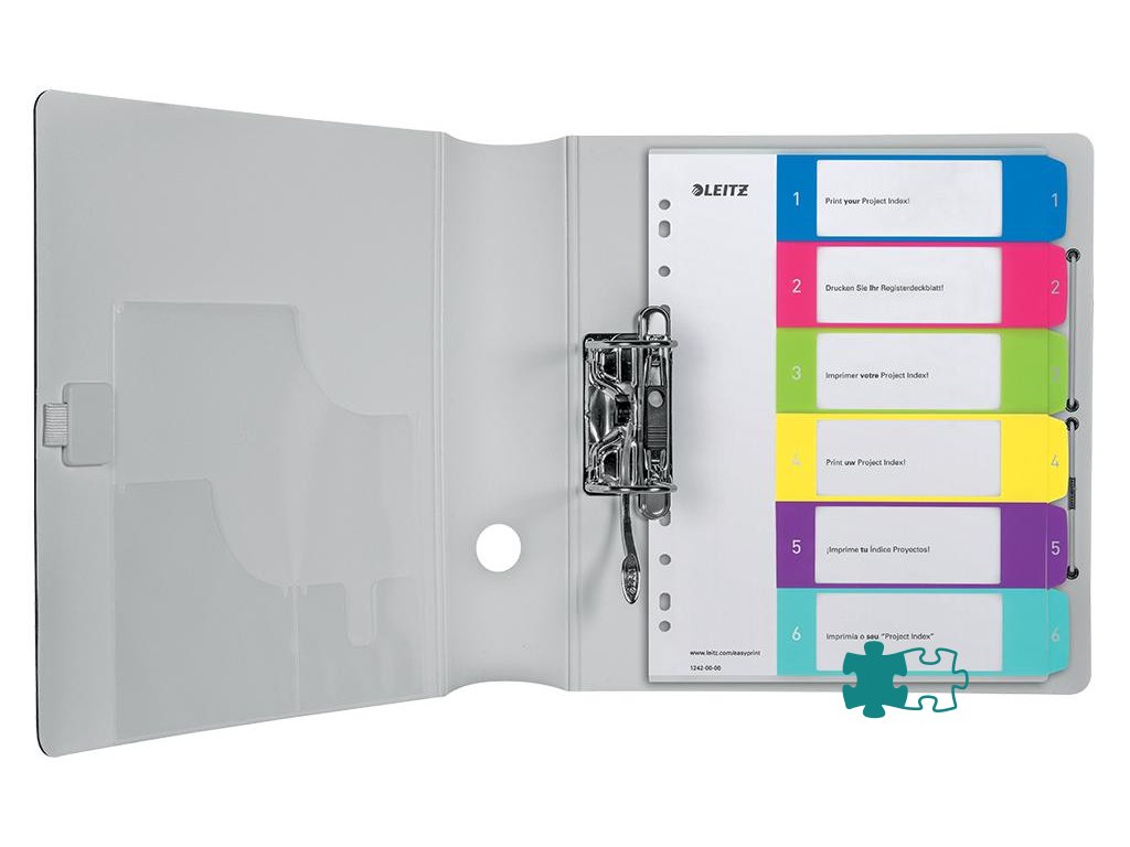 Opakovane použiteľný a extra odolný plastový číselný rozraďovač 1 - 6 v žiarivých farebných kombináciách s univerzálnou perforáciou. Materiál odolný polypropylén hrúbky 0,3 mm. Formát A4 maxi. Možnosť potlače na upravenie podľa vlastných potrieb, predloha stiahnuteľná zdarma na www.esselte.com/ easyprint.Dodatočné parametre