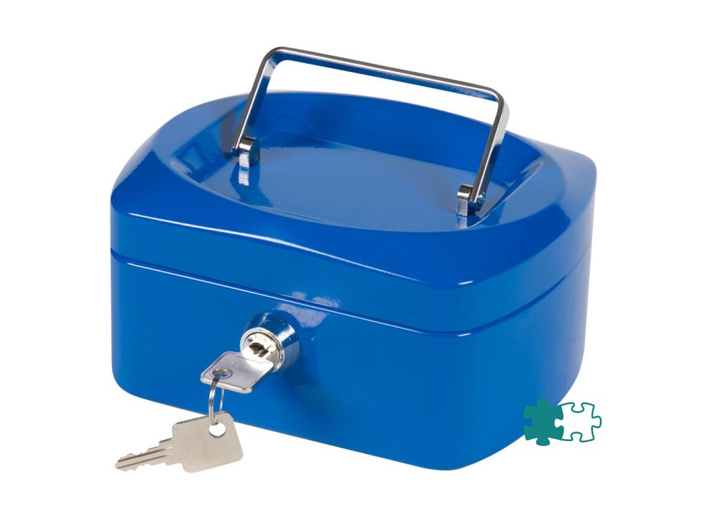 Uzamykateľná pokladnička s tvarovaným úchytom, plastovou priehradkou na mince a 2 kľúčami. Materiál pevná oceľ. Rozmery 155 × 75 × 120 mm. Farba modrá.Dodatočné parametre