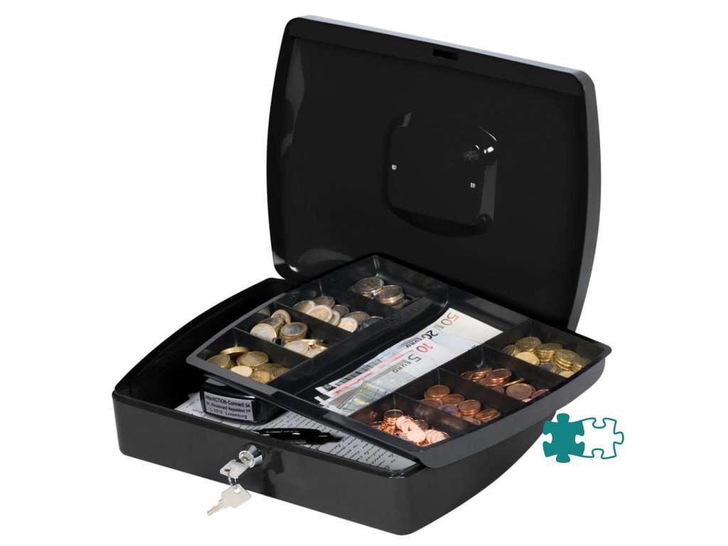 Uzamykateľná pokladnička s tvarovaným úchytom, plastovou priehradkou na mince a 2 kľúčami. Materiál pevná oceľ. Rozmery325 × 85 × 235 mm. Farba čierna.
