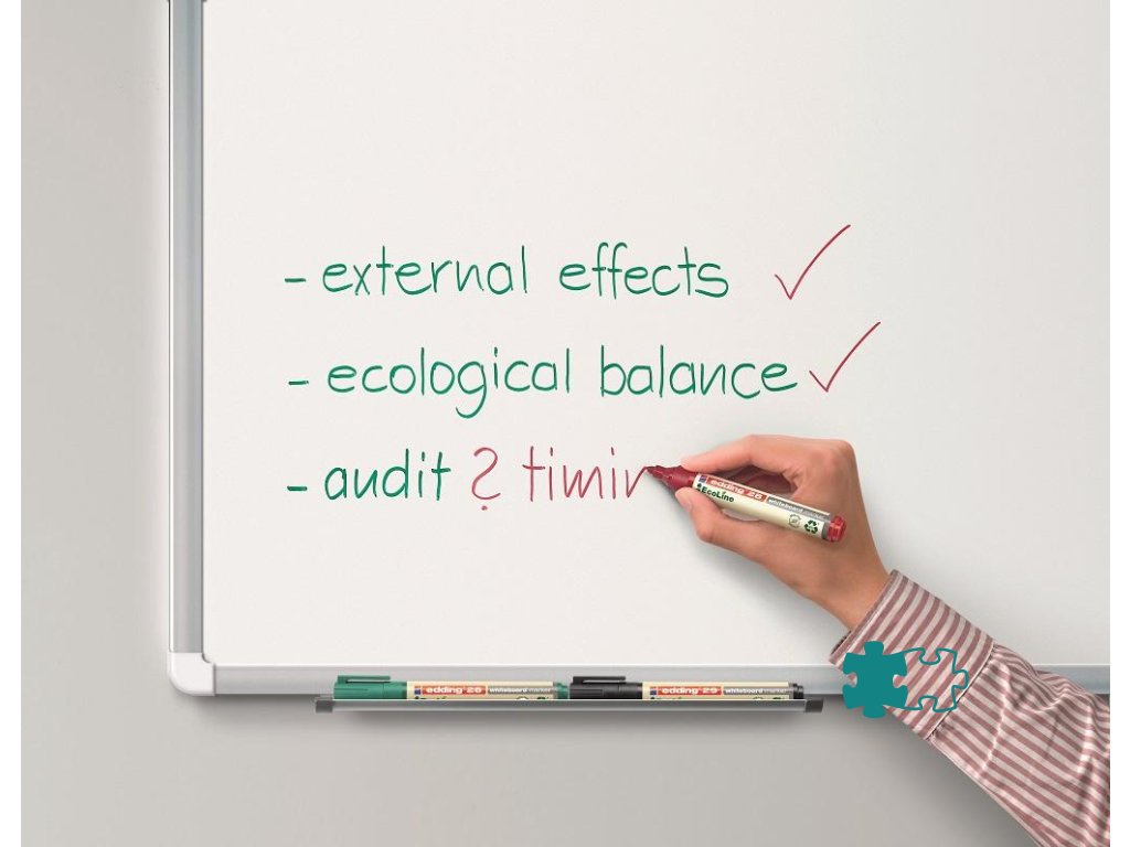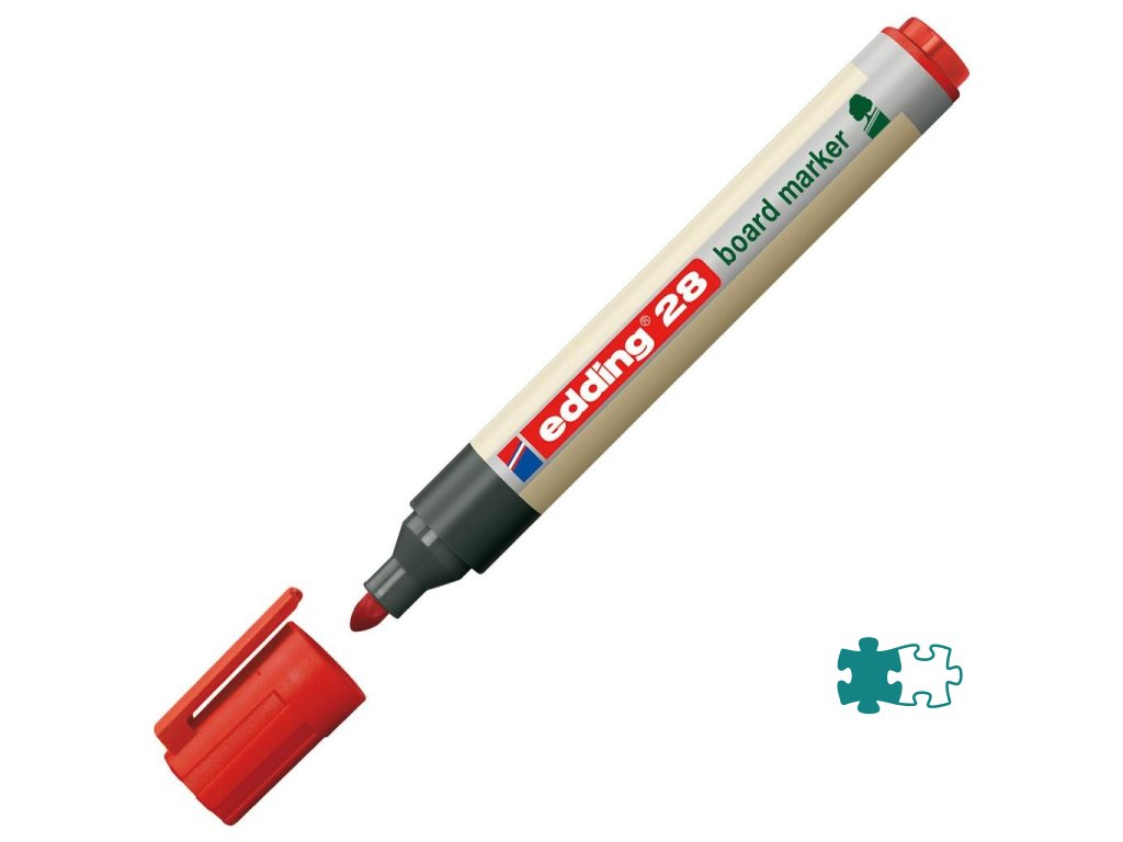 Popisovač na biele tabule, za sucha stierateľný prakticky zo všetkých neporóznych povrchov, ako je keramická úprava, melamín i sklo. Minimálne 80 % plastovej časti je vyrobených z recyklovaného materiálu. Okrúhly hrot, šírka stopy 1,5 - 3 mm. Rýchloschnúci, vodeodolný, slabo zapáchajúci atrament intenzívnej farby. Krátky čas vydrží neuzavretý bez vyschnutia. Väčšie balenie 10 ks.Farba: červená