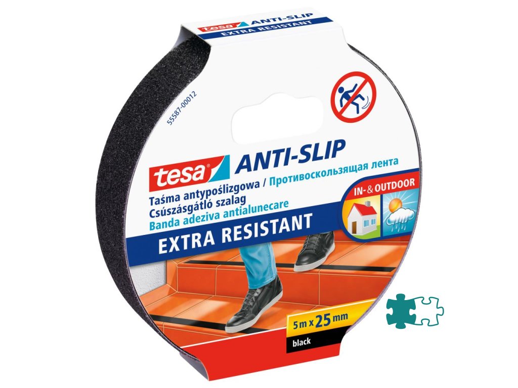 Protišmyková páska tesa® je účinným prostriedkom na prevenciu pádov na kritických miestach, ako sú schodové rohožky, rampy, klzké podlahy alebo paluby. Táto páska nielenže zaisťuje veľmi silnú priľnavosť, je tiež odolná voči UV žiareniu a vode, extrémnym teplotám a čistiacim prostriedkom. Bezpečne sa prilepí k akémukoľvek klzkému povrchu zbavenému nečistôt, oleja a mastnoty. Rozmery 25 mm × 5 m. Farba čierna.Dodatočné parametre