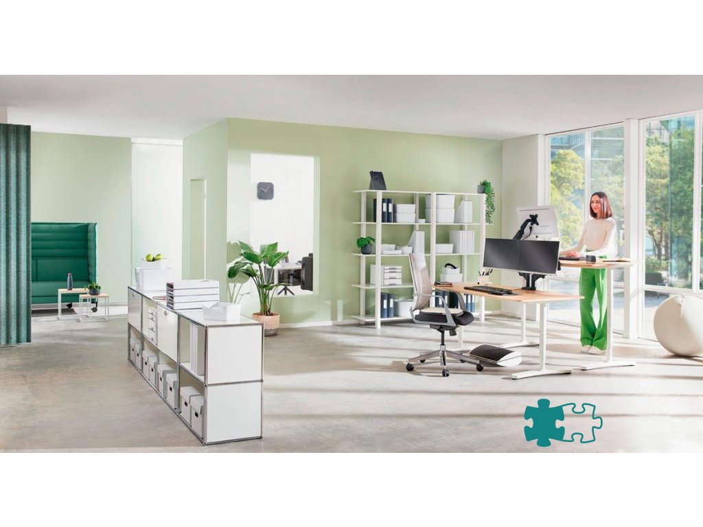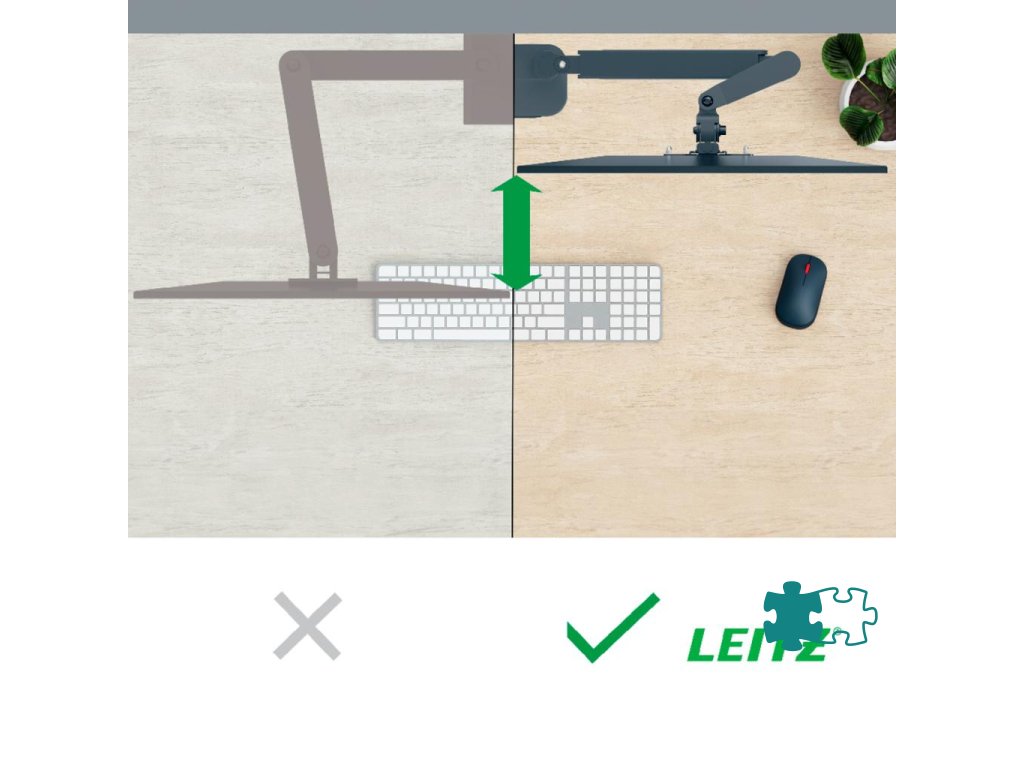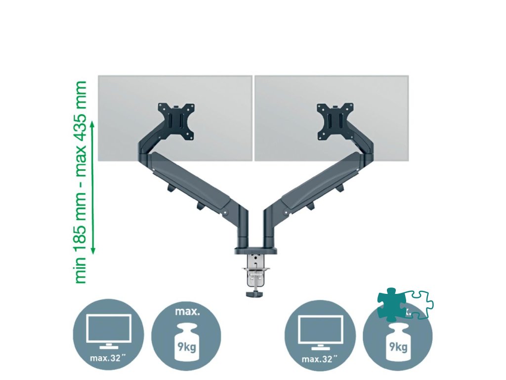 Súprava dvoch ramien na monitor a držiaka na notebook. Podpora obľúbenej aplikácie pre domácu kanceláriu: použitie obrazovky notebooku ako druhého monitora. Bezpečne držia notebooky do veľkosti 17 palcov a hrúbky 2,4 cm. Nezakrýva USB a ďalšie sloty.Zjednodušené nastavenie výšky zásten (185 mm - 435 mm) vďaka pružine